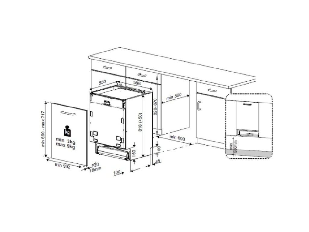 S časovnim zamikom (3, 6 ali 9 ur) lahko programirate začetek pomivanja po svojih potrebah. Samonastavljiva vzmet na vratih zagotavlja mehko odpiranje, zadnje nogice pa je mogoče nastaviti spredaj za optimalno izravnavo aparata. Vgradna niša: 820–870 mm.