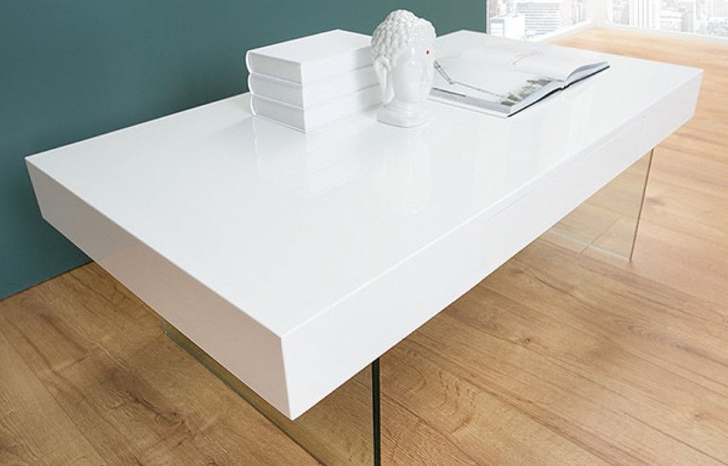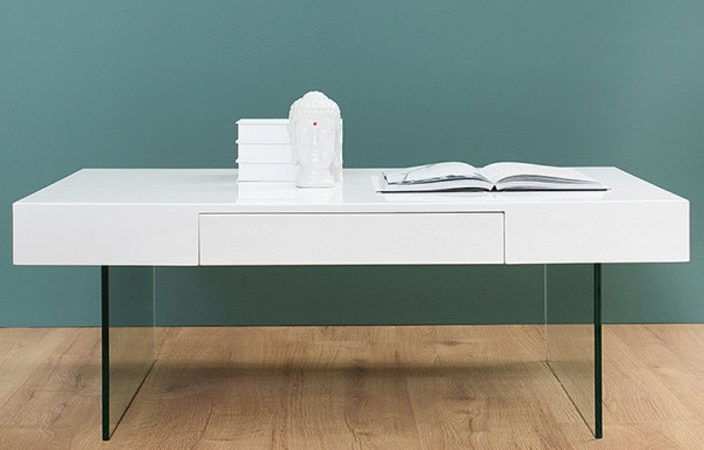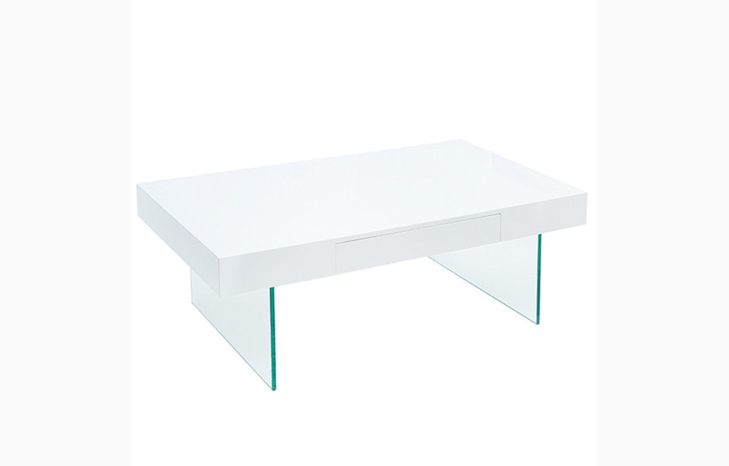 Klubska miza KENZO III sodobnega dizajna videza, iz MDF materijala bele barve visokega sijaja, z enim predalom in steklenimi stranicami.