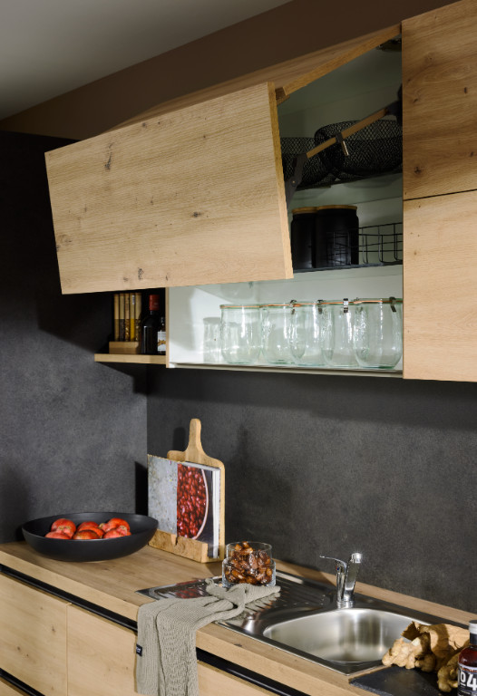 Kuhinja ANABELLE je izvedljiva kot klasična kuhinja z ročaji ali v vedno bolj iskani izvedbi Linea brez ročajev. Na dotik prijetna ličnica vas bo navdušila tudi v kombinaciji z lesnimi dekorji, ki dodajo kuhinji posebno toplino ali pa se lahko poslužite kombinacije z imitacijami betona in kamna, da dodate kuhinji posebno sodoben videz.