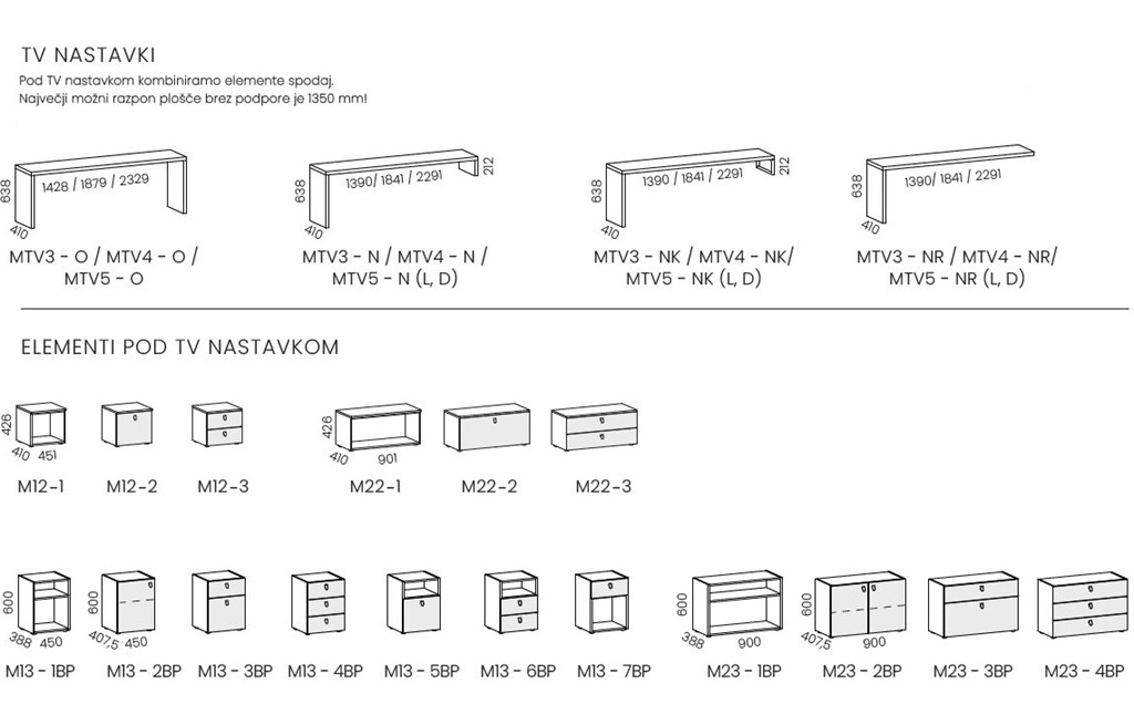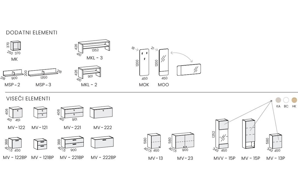 • viseči elementi s predali, vrati ali z dodatkom stekla