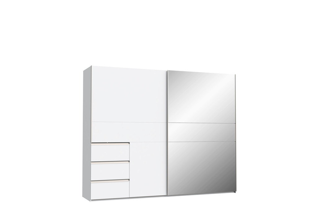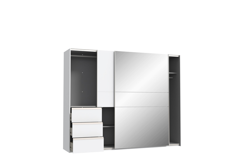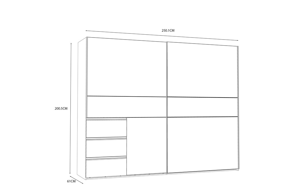 Drsna omara WINN 250 cm je široka dvodelna garderobna omara z drsnimi vrati, primerna za spalnice, predsobe, dnevne sobe. Omara je na voljo v dveh različnih barvnih varijantah. Notranjost omare je razdeljena na dva dela s vertikalno pregrado.