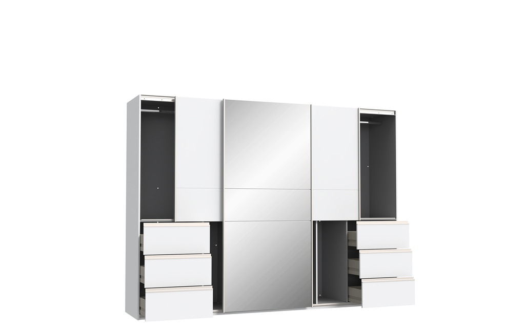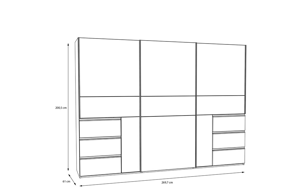 Drsna omara WINN 270 cm, velika tridelna garderobna omara, na voljo v beli barvi z sredinskim ogledalom ali v kombinaciji hrasta in temno sive barve. Središčni prostor ima zgoraj eno polico z nosilnostjo 20 kg in globine 42 cm, ter eno letev za obešanje dolgih oblačil z nosilnostjo do 25 kg. Središčna vrata so pri beli varijanti opremljena z ogledalom, pri hrastovi varijanti pa mat temno sive barve. Na levi in desni strani garderobe so spodaj po trije predali, široki 54 cm, globoki 34 cm ter z nosilnostjo do 5 kg, ob njih pa še prostor za shranjevanje manjših stvari, širine 31 cm in višine 81 cm. Zgornji del leve in desne strani ima vsak po eno letev za obešanje oblačil, prav tako z nosilnostjo do 25 kg. Garderobna omara je izdelana iz kvalitetnega iverala, prevlečenega z melaminom za lažje čiščenje, črne nogice pa so iz plastike.Opis: