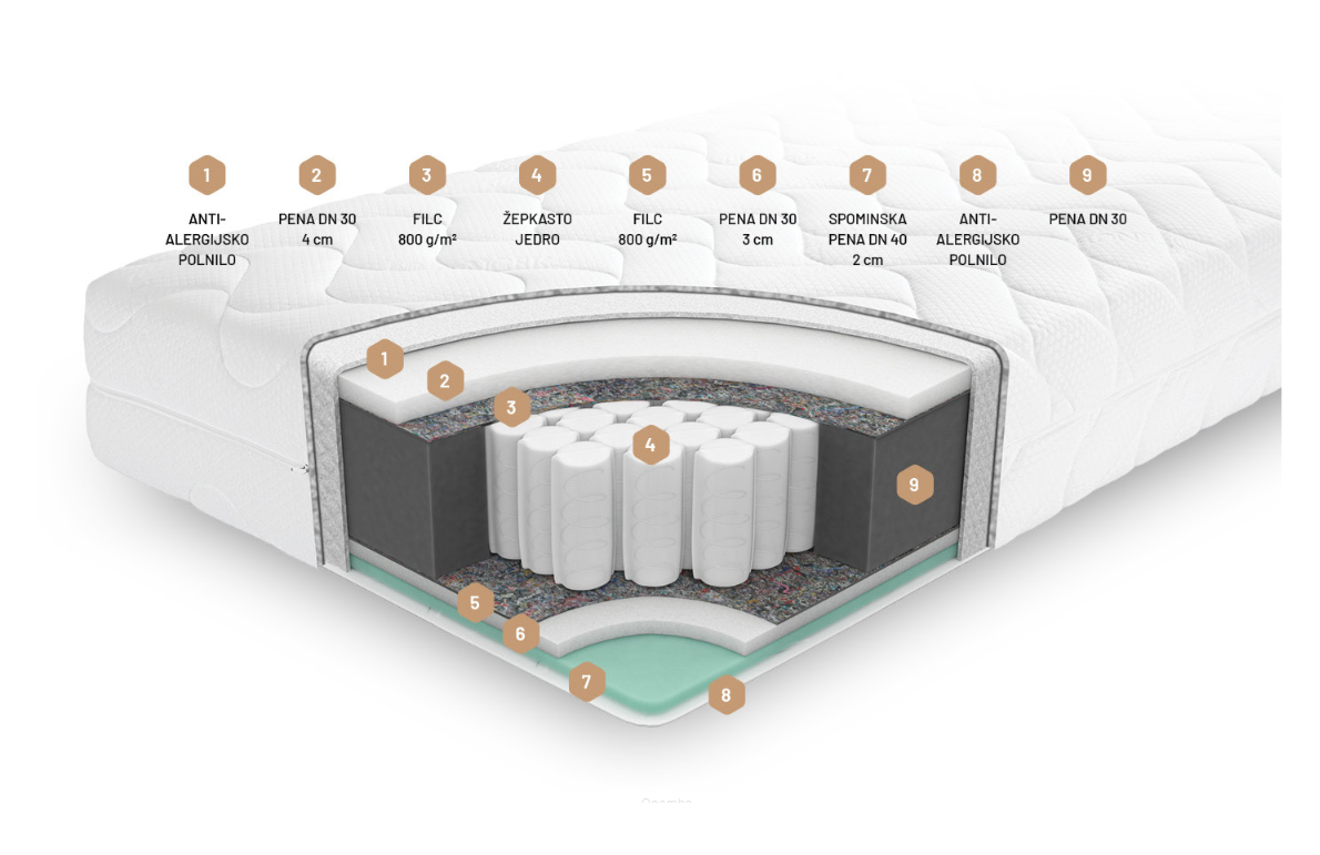 V notranjosti se nahaja napreden sistem žepkastih vzmeti, ki omogoča točkovno prilagajanje telesu in nudi stabilno, uravnoteženo podporo. Vsaka vzmet deluje samostojno, kar pomeni manj prenašanja gibanja in bolj miren spanec.