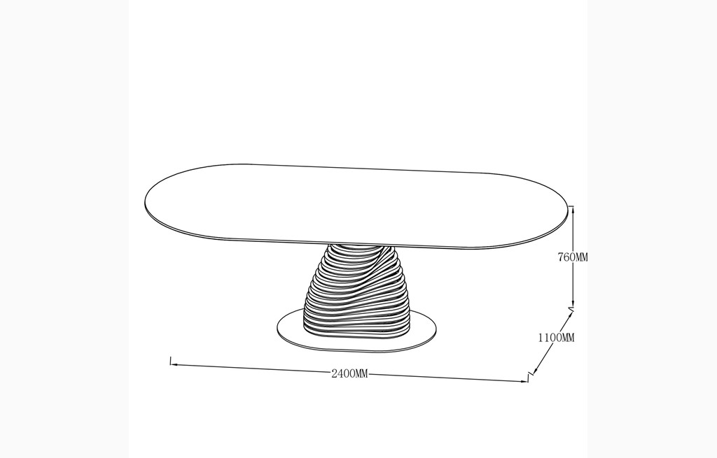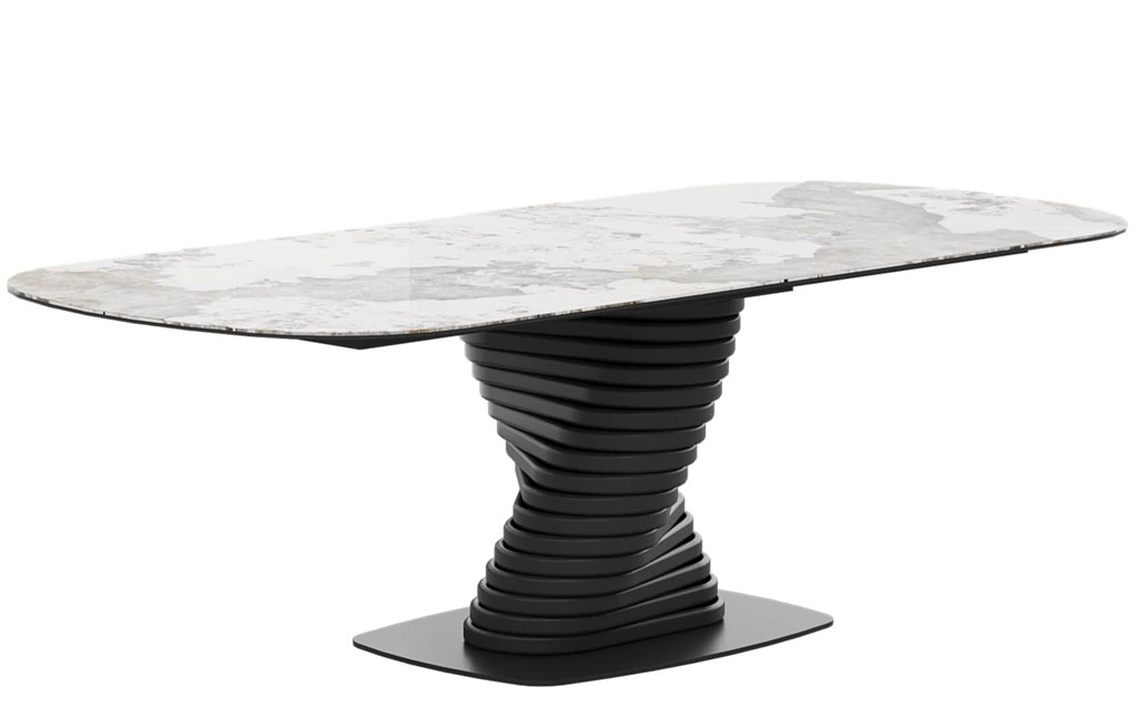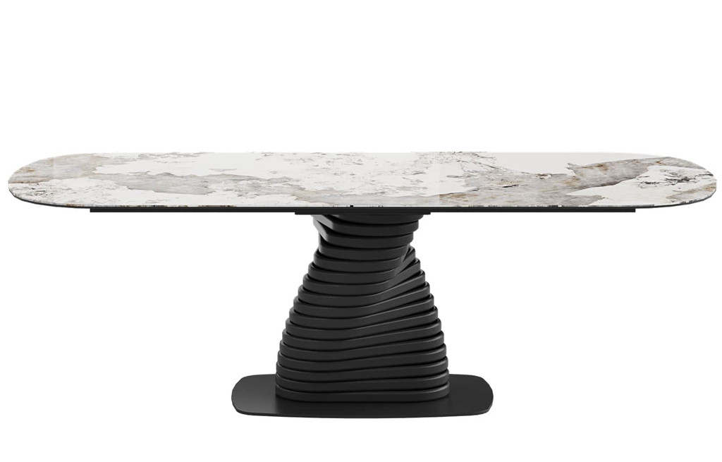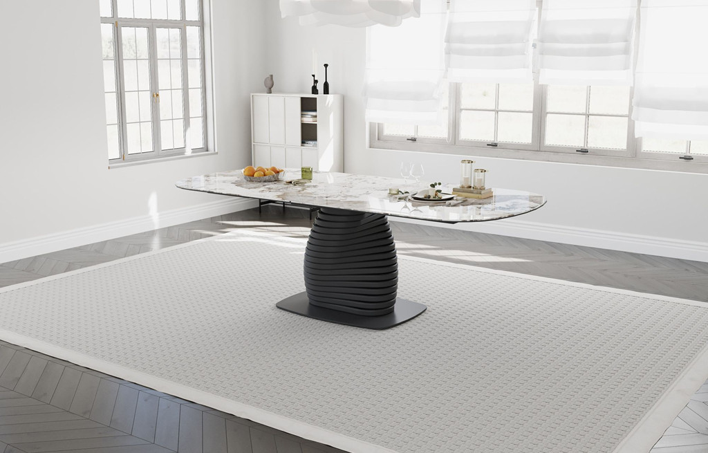Ploščo podpira izoblikovano kovinsko podnožje s črnim prašnim premazom, za odpornost proti okoljskim vplivom koroziji kovine. Oblika podnožja z enim samim nosilnim stebrom na talni plošči omogoča tako stabilno podporo kot tudi prilagodljivo sedenje brez nepotrebnih podpornih elementov v kotih. Miza lahko prenese do 150 kg obremenitve, primerna za vsako gospodinjsko uporabo.