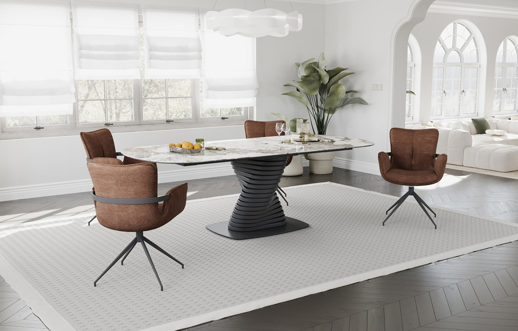 Miza SANAS z velikostjo 240 x 100 cm je velika jedilna miza iz kombinacije stekla in keramike v rjavi barvi. Trpežna površina, odporna na praske in toploto, ter primerna za dolgotrajno uporabo.