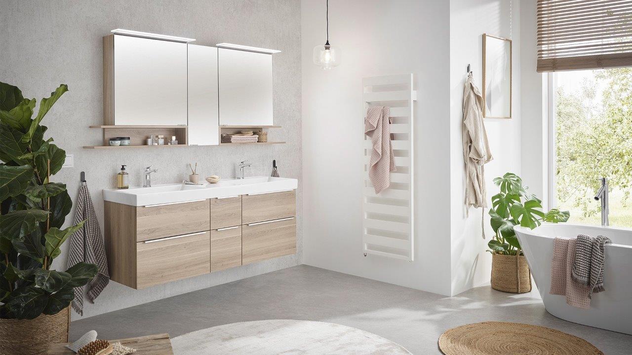 Značilnosti kopalnice PURIS C!mano so moderne ravne linije in omarice z ročaji ali brezročajna izvedba.