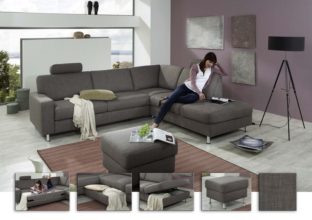 Kotna sedežna garnitura NICE proizvajalca Polipol je moderna in ima sestavljiv program, kar pomeni, da lahko dosežemo različne oblike postavitev v različnih dimenzijah. Nudi možnost izbire ležišča, predalov za posteljnino in vzglavnikov.