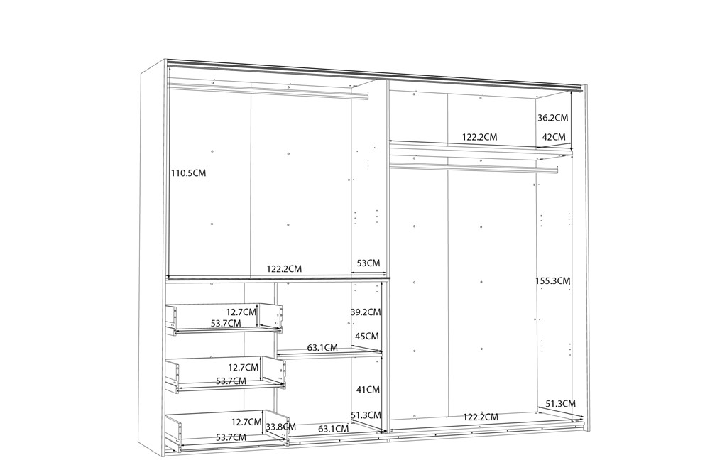 Ena stran omare ima na vrhu eno samo letev za obešanje, spodaj pa tri enako velik predale ter ob njih še en manjši kabinet z eno notranjo poličko, velikosti 63x45 cm. Letev za obešanje oblačil lahko nosi do 25 kg, predali lahko nosijo vsak do 5 kg, vrh predalnika pa lahko zdrži do 15 kg.