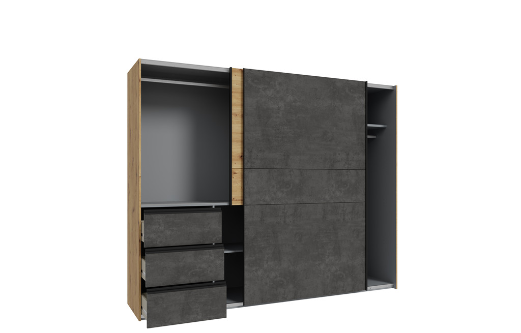 Drsna omara WINN 250 cm je široka dvodelna garderobna omara z drsnimi vrati, primerna za spalnice, predsobe, dnevne sobe. Omara je na voljo v dveh različnih barvnih varijantah. Notranjost omare je razdeljena na dva dela s vertikalno pregrado.