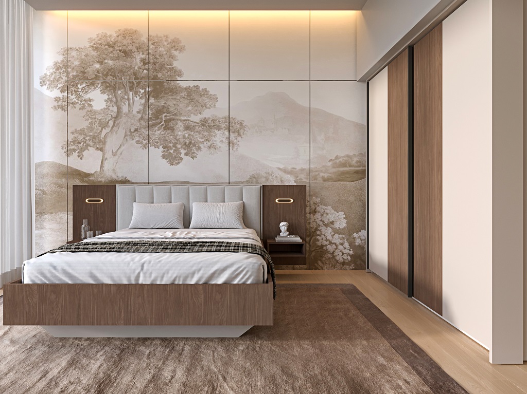 Moderna spalnica DELUXE. Spalnica je na voljo v dveh barvnih kombinacijah - kanela/kašmir in oreh/kašmir. Serijo sestavlja več elementov, katere lahko po želji kombinirate. Izbirate lahko med drsno omaro in štiridelno omaro, posteljo in nočno omarico z osvetlitvijo. Pohištvo je izdelano iz 18mm plošč oplemenitegega iverala. Vsi elementi serije so opremljeni s sistemo mehkega zapiranja.