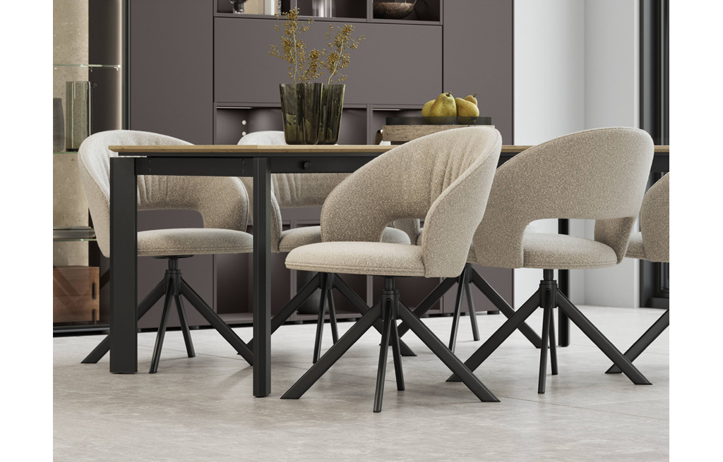Jedilna garnitura TURNII-CHA. Garnituro sestavljajo stoli TURNII-CHA in miza . Artikle lahko naročite v različnih barvnih kombinacijah.
