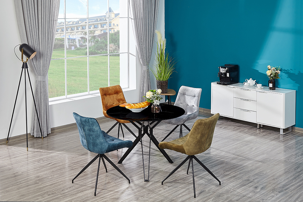 Okrogla trendovska miza s ploščo iz kaljenega stekla.